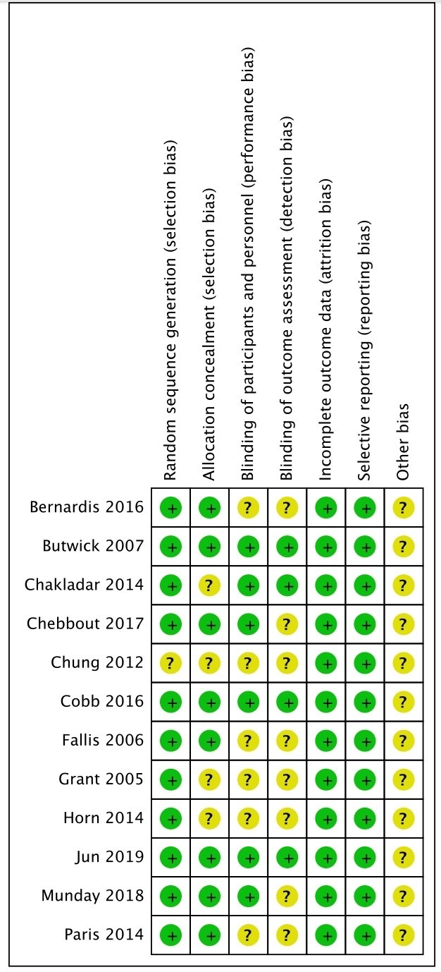 The basic characteristics of the included studies are presented in Table 1 (Ref. [11, 12, 13, 14, 15, 16, 17, 18, 19, 20, 21, 22]). The included literature encompasses studies from the United States, the United Kingdom, Germany, Canada, South Korea, and other countries, with a total of 1184 patients across the included studies, of which 591 were in the experimental group and 593 in the control group. 9 articles provided detailed reports on randomization methods, 11 articles described the concealment of the allocation sequence, 6 articles described how blinding was implemented for the study subjects and interventionists, and 4 articles introduced blinding for outcome assessors. The specific results of the risk of bias assessment for the included studies are shown in Fig. 2. In this study, grade rating was used for analysis. The results of the analysis (Table 2) suggested that the results of surgery/core temperature at the time of PACU entry, incidence of hypothermia, and incidence of shivering were of low quality.