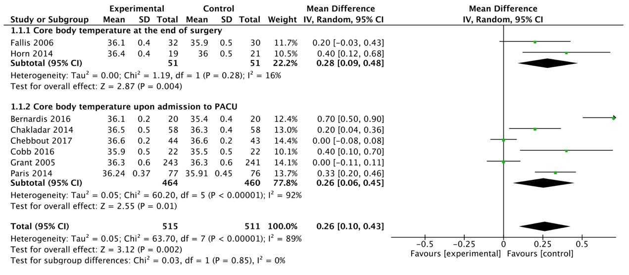 Forest plot of core temperature meta-analysis. CI, confidence interval; PACU, post-anesthesia care unit.