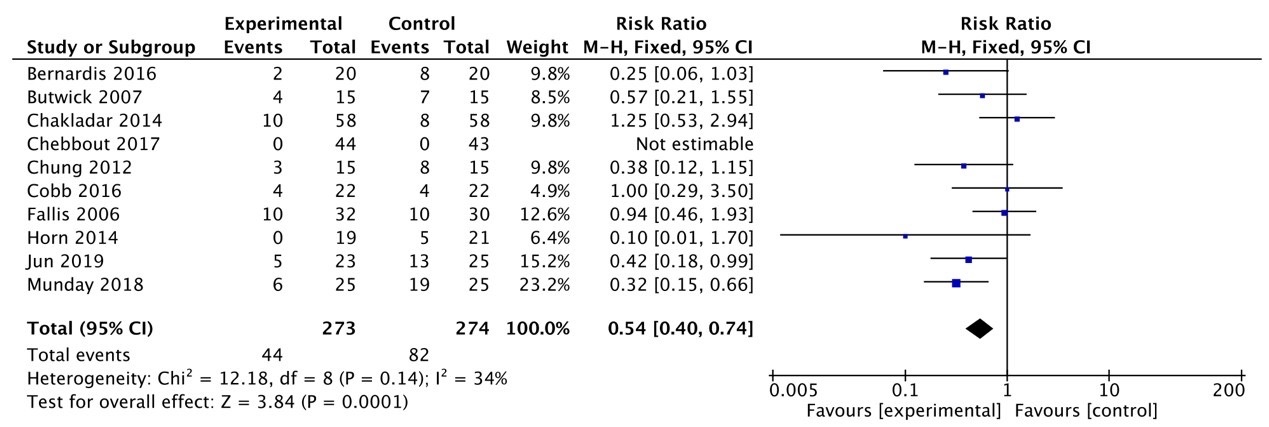 A total of 10 studies were included to compare the impact of AW devices on the incidence of shivering in cesarean section patients during the perioperative period, involving 689 patients. There was low heterogeneity among the studies (I2 = 34%, p = 0.14), thus a fixed-effects model was used. The results indicated that the incidence of shivering in the experimental group of cesarean section patients was significantly lower than that in the control group [RR = 0.54, 95% CI: (0.40, 0.74), p = 0.0001]. See Fig. 6.