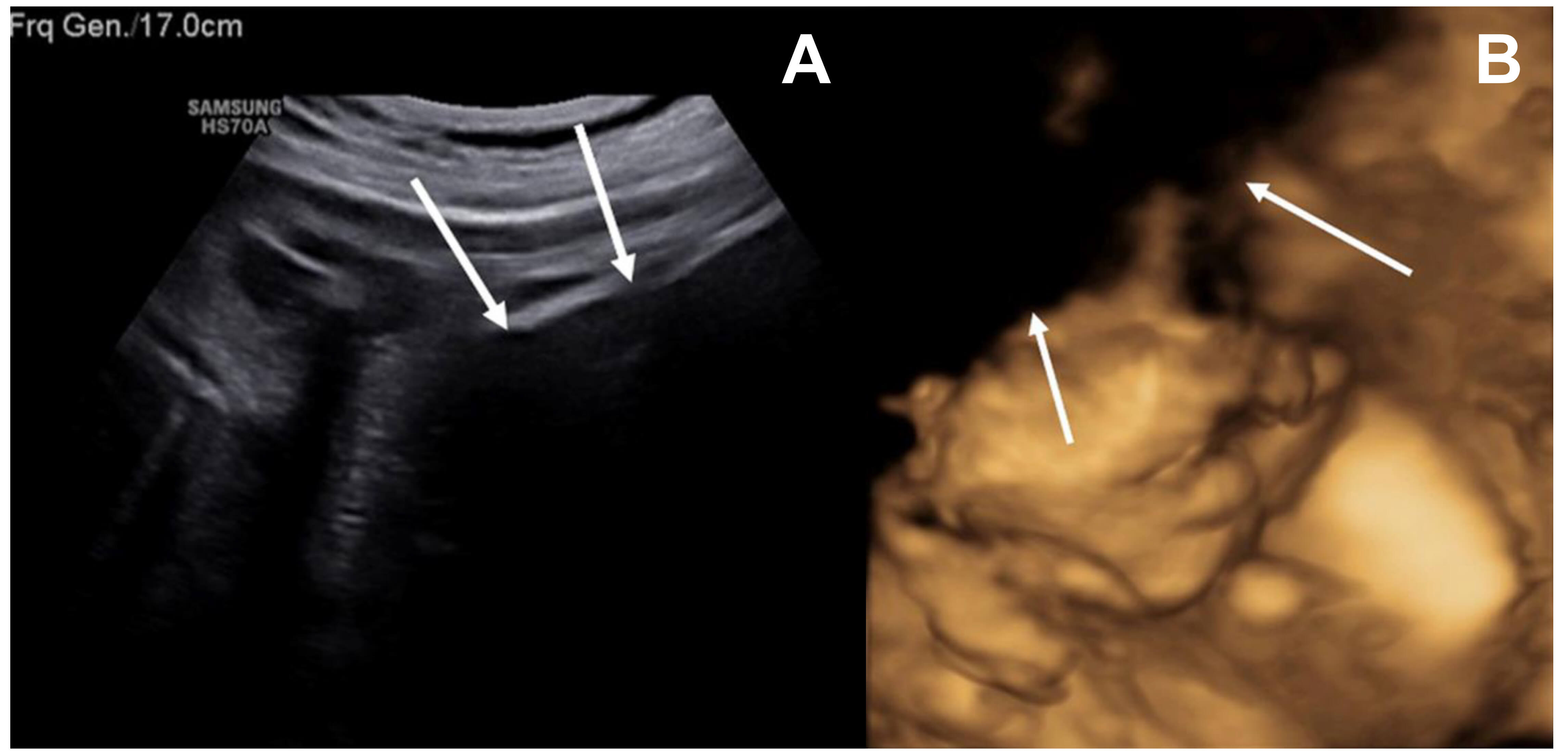 Maternal lower abdominal hypoechoic mass limiting acoustic penetration on fetal ultrasonography. (A) Ultrasound imaging was limited by a large hypoechoic mass-like lesion in the maternal lower abdomen, which impeded adequate acoustic penetration. (B) A portion of the fetal face was not visualized on the three-dimensional ultrasound due to the presence of a maternal lower abdominal hypoechoic mass-like opacity. White arrows highlight the hypoechoic mass-like region interfering with acoustic penetration.