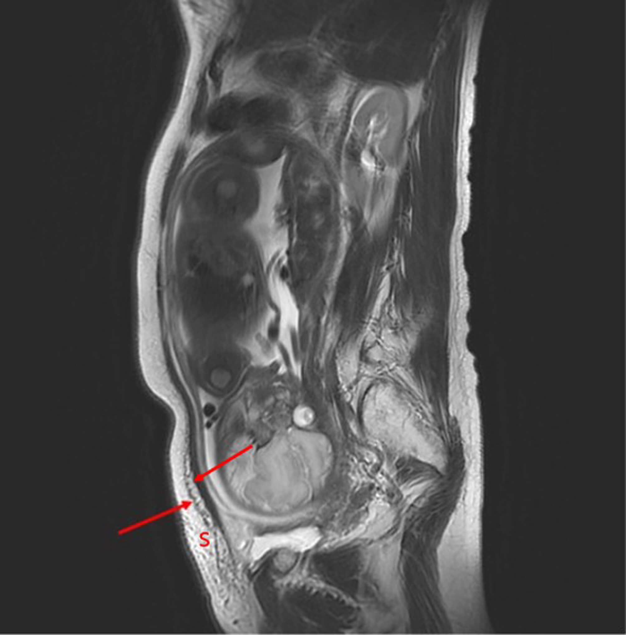Sagittal non-enhanced pelvic MRI demonstrating abdominal wall fluid collection. Sagittal non-enhanced pelvic MRI revealed hyperintense fluid collections containing small, round, bubble-like particles located between the subcutaneous tissue and fascial layer of the abdominal wall (red arrow). S, subcutaneous tissue; MRI, magnetic resonance imaging.