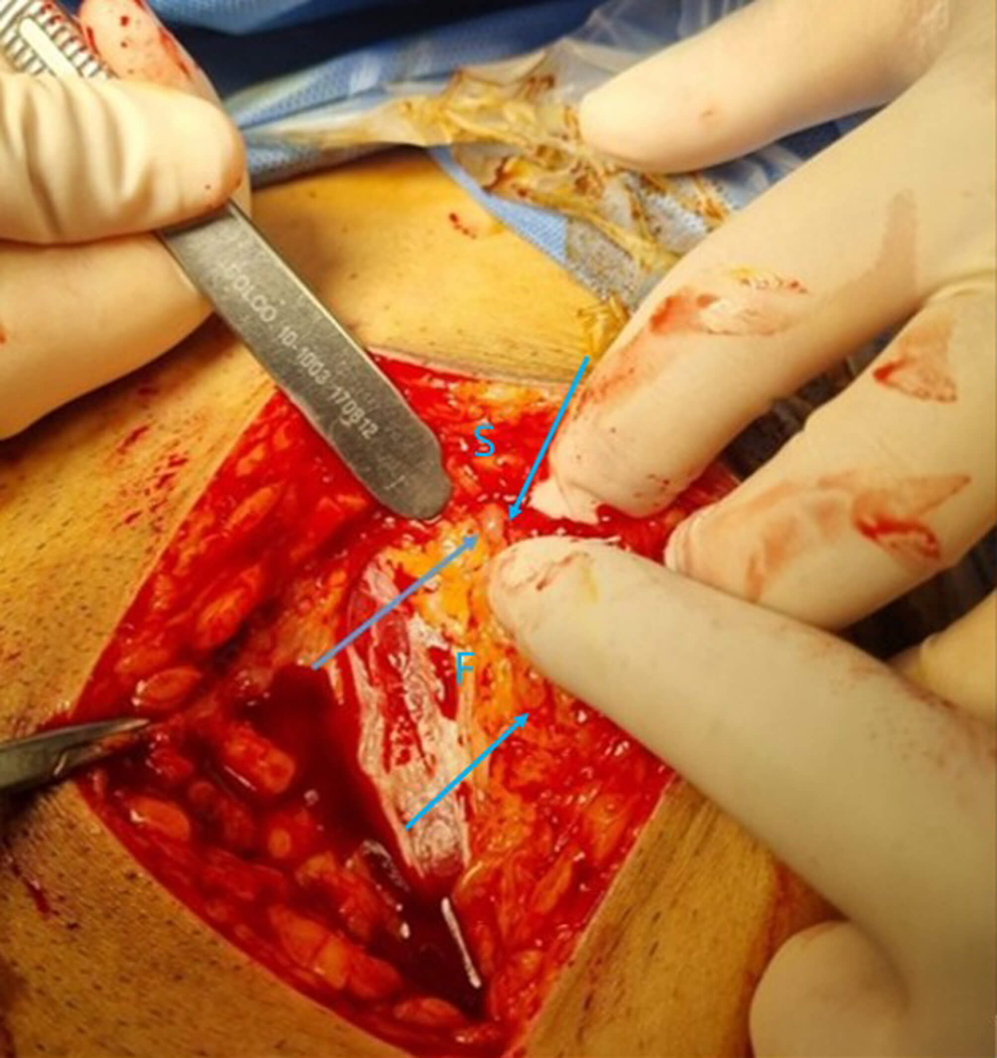Gross appearance of subcutaneous filler nodules. Small, translucent filler nodules, approximately 5 mm in diameter, were observed beneath the subcutaneous tissue, adjacent to the fascial layer (blue arrow). S, subcutaneous tissue; F, fascia.