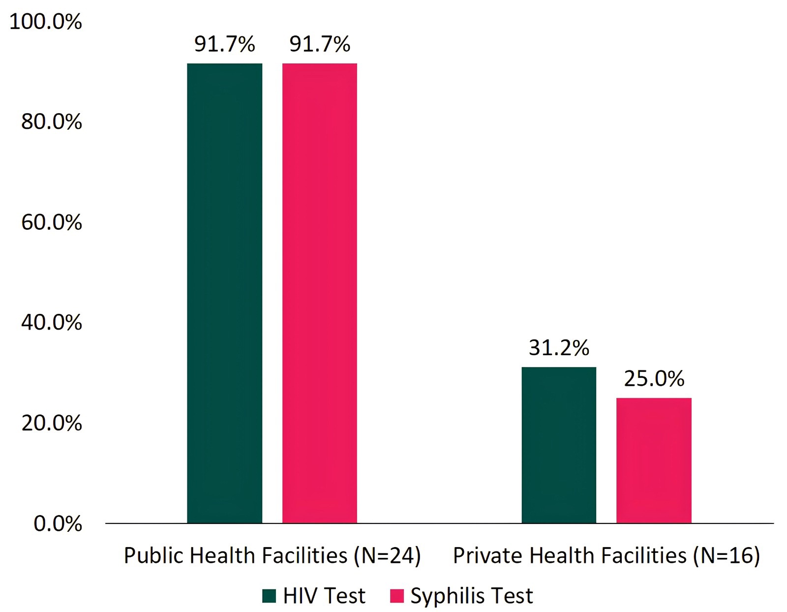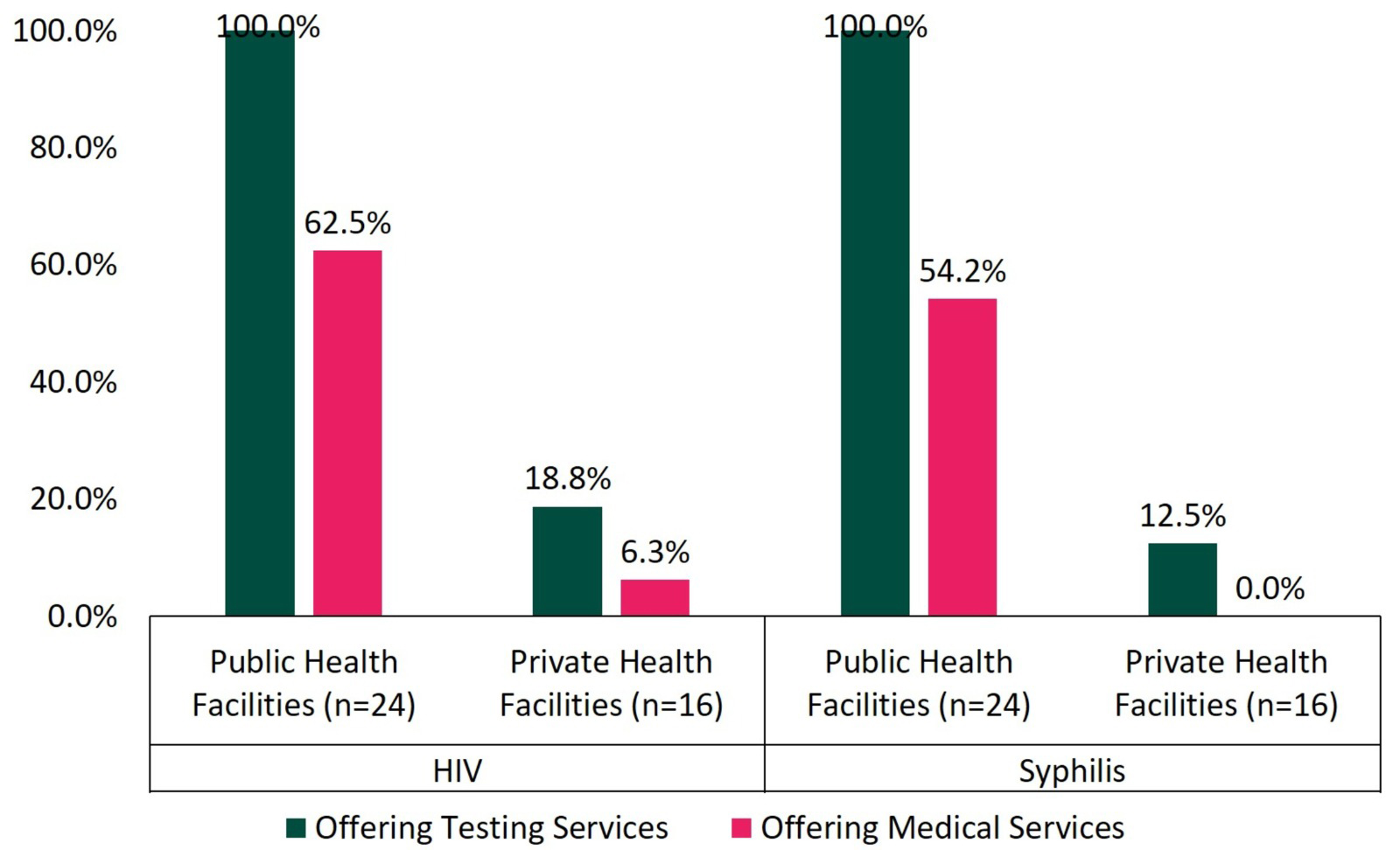 25.0% provide syphilis testing. Public health facilities are significantly more