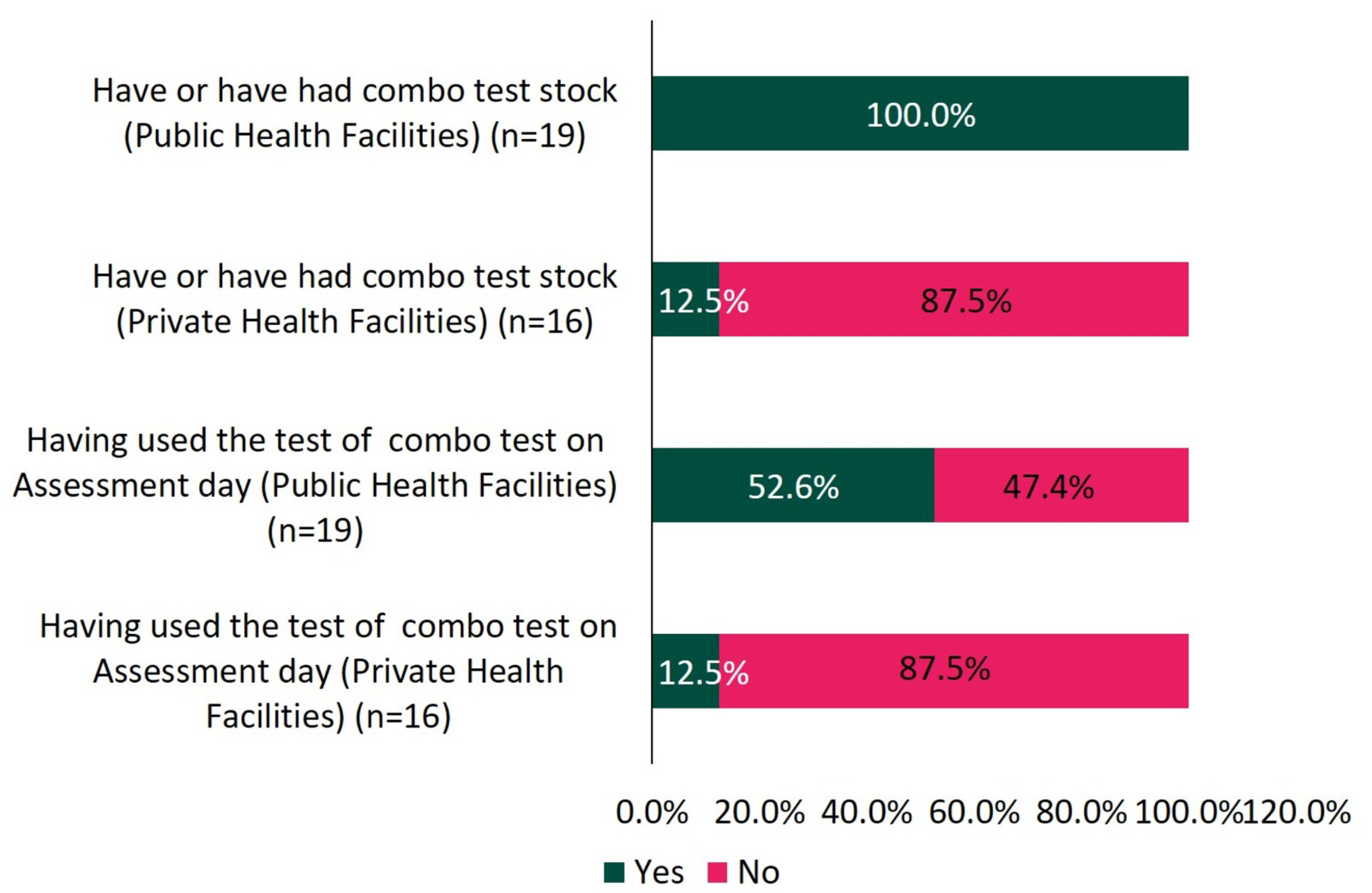 Proportion of ownership and use of combination test stock on the day of assessment in public and private health facilities.