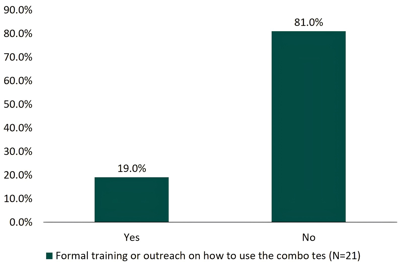 Fig. 4 shows that, across both public and private sectors, 21 health facilities had providers who reported using the combination test. Of these, the majority reported ease of use, although only 19.0% (4/21 health facilities using the combination test) reported receiving any formal training or outreach on its use.