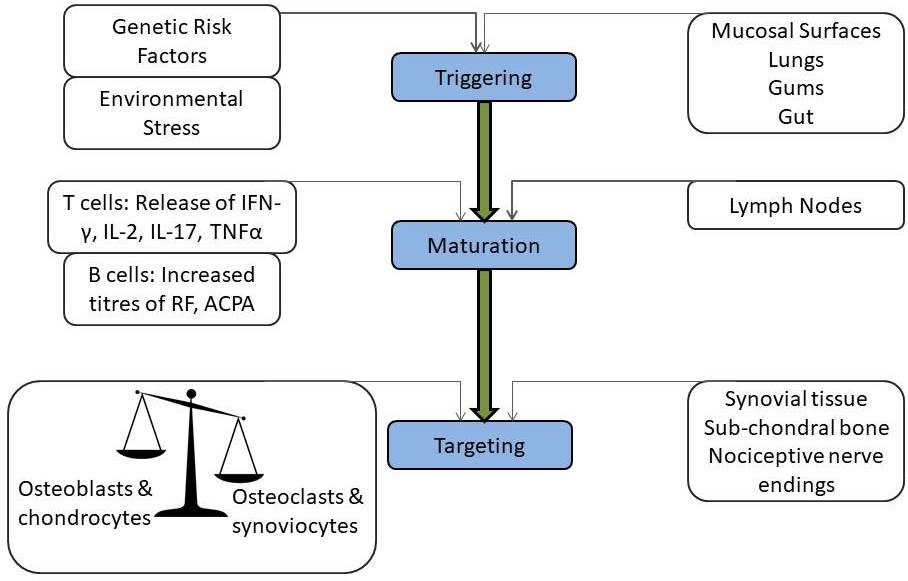 Rheumatoid arthritis (RA) is a complex progressive multisystem autoimmune disease characterized by chronic pain and swelling, affecting primarily the peripheral joints (1). RA is associated with symmetric arthritis characterized by synovial hyperplasia, cartilage damage, and joint deformities, which lead to progressive functional disability, reduced quality of life, early death, and increased socioeconomic burden (2).Various environmental and lifestyle-associated factors are known to induce and perpetuate autoimmunity. In RA, the autoimmunity is linked with an aberrant immune system in which the distinction between foreign and self-antigen is not absolute. The well-established symptomatic disease is preceded by a period of an asymptomatic low physiological level of self-reactivity, which is characterized by the presence of circulating autoantibodies (3). The etiology of RA is still unknown, but various factors predispose an individual to develop the disease. The interaction of multiple factors, including genetic, hormonal, and environmental, leads to the initiation and propagation of autoimmune diseases like RA (Table 1). Also, psychological stress and depression are known to precipitate the state of auto-inflammation and autoimmunity (4). There is a bi-directional association of comorbid depression with the pathophysiology of RA due to dysfunctional neuroendocrine system, systemic inflammation, accelerated immune aging, oxidative DNA damage, and abnormal DNA damage sensing and repair machinery. An asymptomatic pre-clinical stage precedes the establishment of symptomatic RA, which is characterized by synovial inflammation leading to progressive joint erosion (5). RA affects both articular and extra-articular systems, including skin, eye, heart, lung, kidneys, nervous, and gastrointestinal systems, making it a systemic disease (6). RA is associated with joint damage causing progressive disability, systemic complications leading to increased morbidity, mortality, and socioeconomic costs, which further aggravate psychological stress. For the clinical remission of the disease and prevention of associated disabilities, an aggressive therapy targeting the symptomatic relief as well as disease modification is necessary. Soon after the diagnosis of the disease, an early intervention including disease-modifying anti-rheumatic drugs (DMARDs) and biologic disease-modifying therapies sometimes fail to produce the desired response. RA is typically diagnosed when the joint manifestations have begun. The period of the pre-clinical stage lapsed, a time when the window for optimal treatment is likely to be missed. Furthermore, significant proportions of RA patients don’t respond to any given therapeutic agent and hence become prone to multiple disabilities and organ involvement. Hence, the ultimate goal of RA management should be the prevention of inflammatory joint condition and prolongation of remission periods, thereby, prevention of associated depression and disability (7).