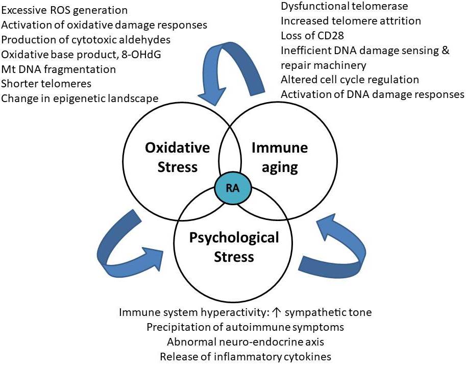 Figure 3Bermuda triangle of OS, Psychological stress and immune aging in RA.