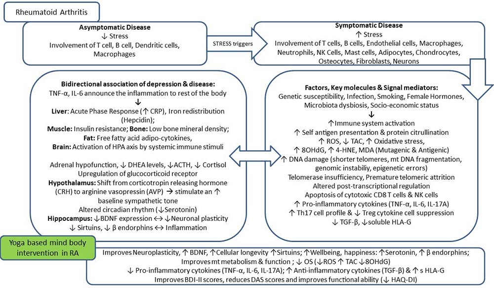 The interest for mind-body interventions is rapidly growing intending to integrate physical, mental, and spiritual dimensions by focusing interactions among brain, mind, body, and behavior. Various studies have documented the association of stress with immunological defects, especially auto-immune diseases via activation of the HPA axis and the sympathetic–adrenal medullary axis (96). RA affects the psychological health of an individual resulting in a life of dissatisfaction, psychological distress, and poor quality of life with more worsening of RA outcome. This co-existence of depression, along with RA symptoms, poses a significant healthcare burden at an individual, care-provider, and social level. High disease activity is associated with elevated depression scores in RA patients, which hampers their quality of life and also the treatment response rate (4). Multiple organ system involvements, along with numerous extra-articular symptoms, may also occur, slowly progressing towards physical disability and psychiatric comorbidity (6). A study from our laboratory documented that yoga intervention can significantly alter the biomarkers, which are associated with neuroplasticity, systemic inflammation, cellular health, and aging in RA patients, which can substantially reduce the disease activity and severity (8). The science of psychoneuroimmunology has paved the way for the establishment and utilization of these therapies as an adjunct. Various studies have evaluated the impact of brain-body interactions concerning clinical symptoms, psychological assessment, and clinical health outcomes (8–10, 18). Further progress will arise from studies for the exploration of the mechanism of action of these therapies at a molecular level.