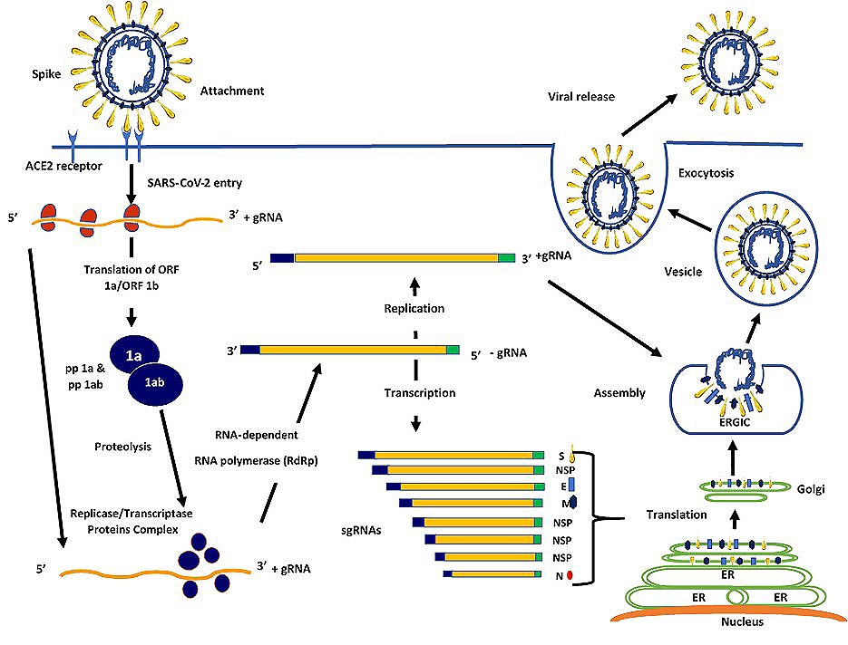 Figure 2Schematic diagram showing the replication cycle of SARS-CoV-2 in a host cell. SARS-CoV-2 attached to the host cell through spikes that bind to ACE2 cellular receptor. Following entry, positive-sense genomic viral RNA (+gRNA) is exposed in the cytoplasm. ORF1a and ab are translated to produce pp1a and pp1ab polyproteins, undergo proteolysis to yield 16 nonstructural proteins (16 nsps) that comprises RNA replicase-transcriptase protein complex. This complex controls -gRNA production, transcription and replication. The +gRNA is produced by replication and group of 7-9 nested sgRNA are formed by discontinuous transcription. Those sgRNAs translated into structural and nonstructural proteins from the first ORF close to 5’ end. Subsequently, +gRNA and nucleocapsids are assembled in the cytoplasm, followed by budding into ERGIC lumen. Finally, mature virus particle released from the host cell through exocytosis.