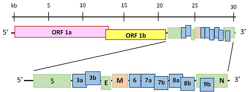 Figure 1Genome organization of human coronavirus COVID-19. The genome size is approximately 30 kilobase (kb). The two-third region encodes for the two main overlapping open reading frames (ORF 1a/b) encode conserved nonstructural polyproteins required for replication-transcription complex (RTC) and virus synthesis (above). The last third of the genome coded for the main structural component proteins including S, E, M and N and a set of accessory genes including ORF3a, 3b, ORF6, ORF7a, 7b, ORF8a, 8b and 9b.