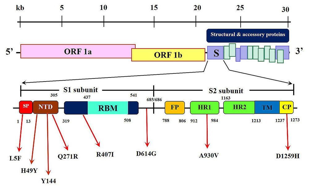 Figure 3Genomic organization of SARS-CoV-2 S spike protein. The upstream region coded by a signal peptide followed by two major subunits S1 and S2. S1 protein subunit contains N-terminal domain NTD), the receptor-binding domain (RBD) that incorporates the receptor-binding motif that binds specifically with ACE2 receptor protein. S2 contain a short fusion protein (FP) followed by two heptad repeats (HR1 and HR2), transmembrane domain (TM) and an intracellular cytoplasmic protein (CM). Sites of expected mutations along the S spike protein encoding genomic from different virus isolates.