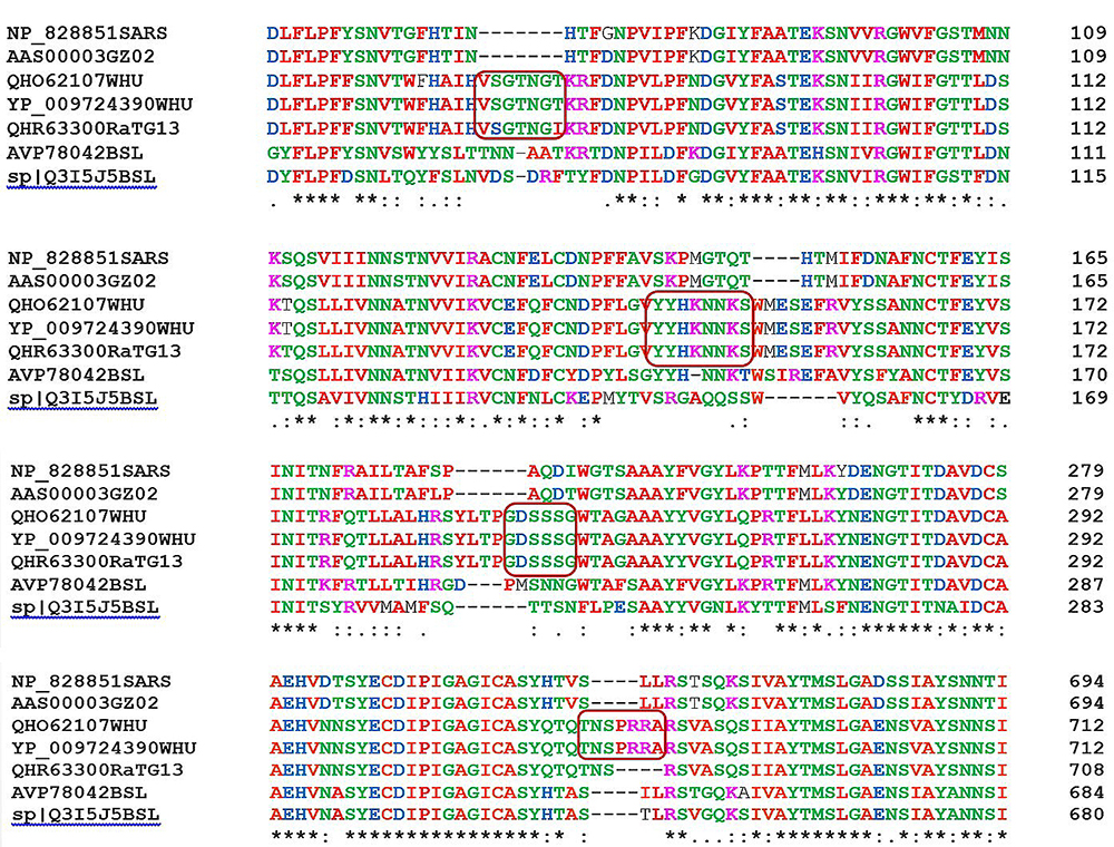 Figure 4Multiple amino acid sequence alignment between SARS-CoV-2 and other coronaviruses using CLUSTAL Omega online tool, EMBL-EBI UK, https://www.ebi.ac.uk/Tools/msa/clustalo/. Four unique sequences highlighted, the first showed high similarity with Bat SARS-like BaTG13.