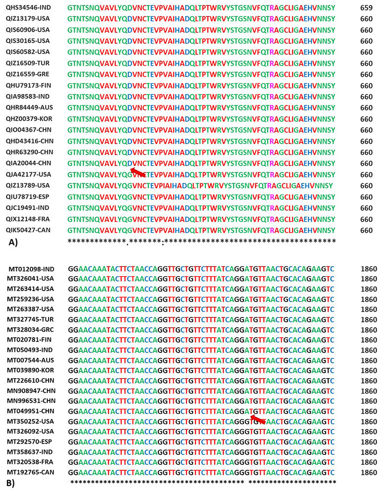 Figure 5Multiple sequence alignment of amino acid (A) and nucleotide (B) sequences of the S spike protein (surface glycoprotein) of SARS-CoV-2 and other coronaviruses using CLUSTAL Omega online tool, EMBL-EBI, UK, https://www.ebi.ac.uk/Tools/msa/clustalo/. S spike protein sequences accession numbers from GenBank, NIH, USA. Alpha-3 country code: according to ISO 3166 international standard. The red arrow reveals the position of the most frequent D614G substitution in amino acids and nucleotide sequences of the spike protein gene in different isolates from North America, Europe and India.