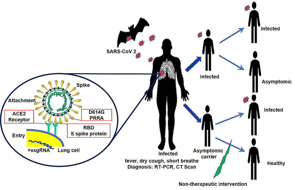 Epidemiologic studies indicated that the outbreak started from a seafood market selling live animals in Wuhan, China; subsequently transmitted to humans and further spread from person-to-person (1, 10, 22, 27). For COVID-19, the main route of human transmission occurs through respiratory tracts via droplets, respiratory secretions and direct contact (22, 28). When the infected person coughs, sneezes, or talks, he/she can transmit the disease through aerosolized droplets that can travel indoor for meters, even in minuscule quantities (29-30). Though the rate of viral transmission by the notably symptomatic diseased individual is high, the extent of the transmission is highly unreliable especially due to the location and medical interventions of the COVID-19 patient (1,31-32).