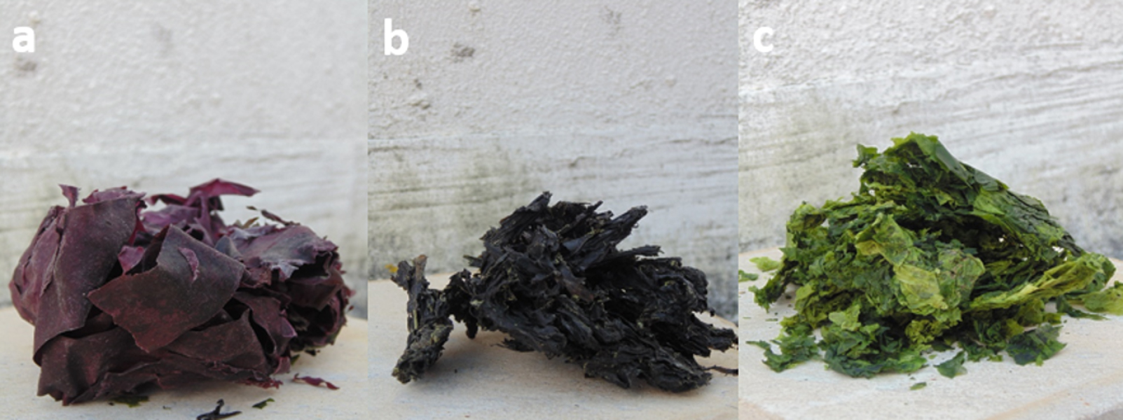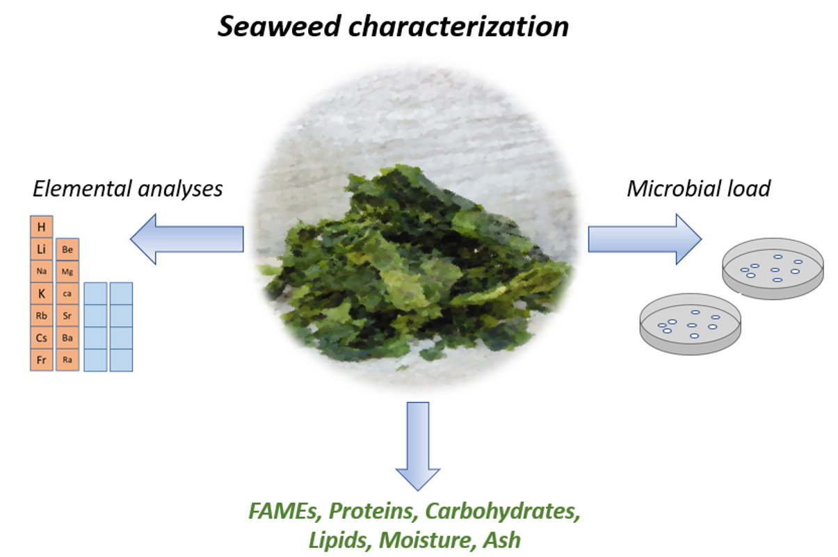 Background: The aim of this work was the study of the proximate composition and profile of fatty acids, minerals, and some microbiological aspects of four edible seaweed species (Chondrus crispus, Palmaria palmata, Porphyra sp., and Ulva sp.) available in the Portuguese market for food consumption, and produced in a national Integrated Multi-Trophic System (IMTA). Methods: Moisture, ash, and total lipids were determined gravimetrically. Crude protein was analysed by Duma’s combustion procedures. The total carbohydrate content was assayed by the phenol/sulphuric acid method. The assessment of the fatty acids methyl esters (FAMEs) was determined through GC-MS. Characterization of elemental analysis was performed by ICP-AES. Different standard microbiological methods were applied for microorganisms. Statistics were performed using the non-parametric Mann–Whitney U test to assess significant differences between samples. Results: Lipid contents (n = 3) were very low (1.6–2.3%), particularly in Palmaria palmata, and Chondrus crispus (1.6–1.7%). The protein content (n = 4) varied from 14.4% in P. palmata to 23.7% in Porphyra sp. Carbohydrates (n = 3) were the major constituent of most seaweeds (31–34%), except in Porphyra sp., with higher content in proteins than carbohydrates. Regarding the fatty acid content (n = 4), in general, saturated fatty acids (SFAs) were the most abundant followed by polyunsaturated fatty acids (PUFAs) and monounsaturated fatty acids (MUFAs). Among macro and trace elements (n = 3), Chondrus crispus shows the highest average content in Zn (71.1 mg