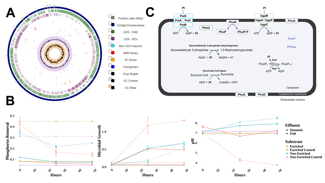A strain designated LAMA1607 was isolated from activated sludge and selected based on its ability to remove total phosphate from the culture medium. Genomic DNA was extracted and sequenced using the Illumina NovaSeq 6000 platform. Assembly and annotation were performed using CLC Genomics Workbench v.24.0 (QIAGEN®) and Rapid Annotation using Subsystem Technology (RAST)/Pathosystems Resource Integration Center (PATRIC) server tools. Functional prediction of uncharacterized proteins was completed using PHYRE2, and secondary metabolite identification was performed using antiSMASH. Further, additional enzymes with biotechnological applications were manually curated through the Association of Manufacturers and Formulators of Enzyme Products (AMFEP) list. The phosphorus removal capability was assessed in domestic and fishery effluents under enriched and unenriched conditions, where pH, microbial growth, and total phosphorus were monitored over 48 hours.