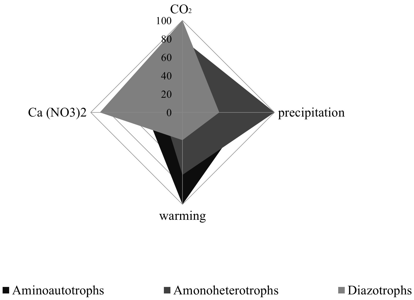 The NCM number and their structure responded to these simulated changes. The increased volume of nitrogen significantly changed the NCM structure, which depends on temperature and precipitation. The dominance of NCMs was noted when the temperature and precipitation remained unchanged. However, the number of microorganisms consuming mineral forms of nitrogen increased following a rise in temperature and a reduction in precipitation. Further, the proportion of microorganisms consuming organic forms of nitrogen increased following a decrease in temperature and increased precipitation. Total NCMs reduced significantly when the CO2 increased; this decrease was most pronounced with increased precipitation. Changes in the group composition of the community are associated with an increase in the nitrification process, with no changes in total NCMs.