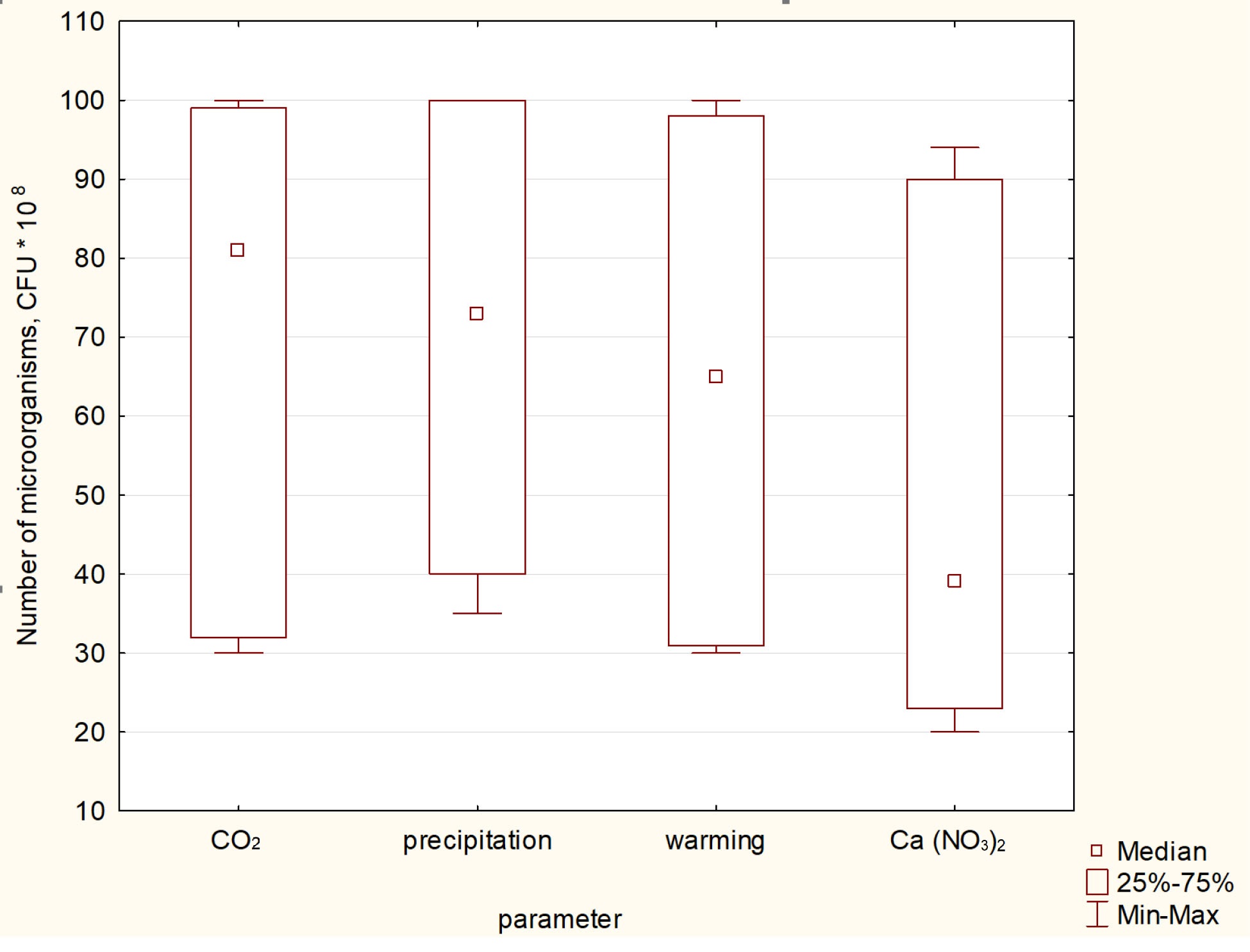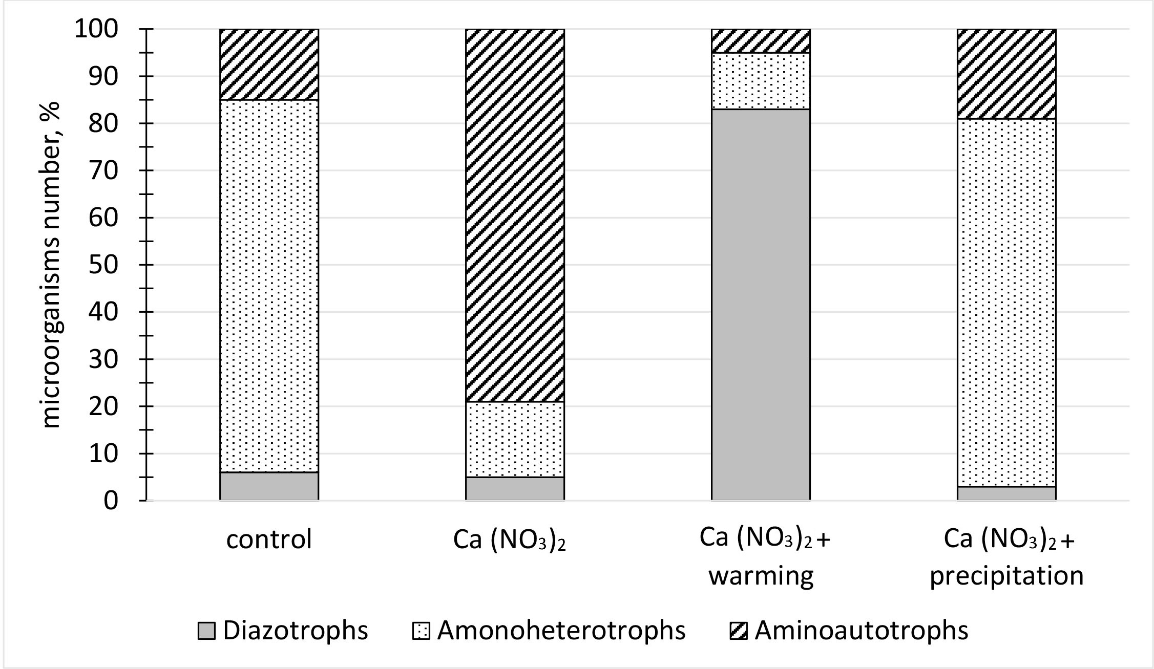 The NCM number and their structure responded to these simulated changes. The increased volume of nitrogen significantly changed the NCM structure, which depends on temperature and precipitation. The dominance of NCMs was noted when the temperature and precipitation remained unchanged. However, the number of microorganisms consuming mineral forms of nitrogen increased following a rise in temperature and a reduction in precipitation. Further, the proportion of microorganisms consuming organic forms of nitrogen increased following a decrease in temperature and increased precipitation. Total NCMs reduced significantly when the CO2 increased; this decrease was most pronounced with increased precipitation. Changes in the group composition of the community are associated with an increase in the nitrification process, with no changes in total NCMs.