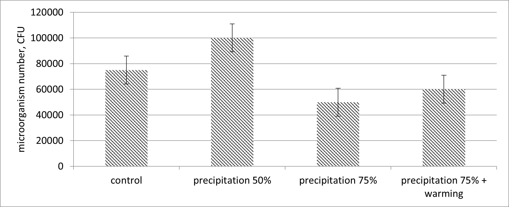 An increase in the microorganism number can occur due to a decrease in water stress with a relatively moderate increase in soil moisture [26, 27]. We see this increase at 50% humidity. A greater increase in soil moisture can reduce the abundance by reducing the oxygen diffusion into the soil [26]. Therefore, the optimum soil moisture reflects a steady-state between these two parameters. This steady-state may be the leading one in this interaction, which the authors have established in the process of studying many factors. The elevated temperature reduces water stress and increases the oxygen to the soil access, since a humidity increase leads to a net negative effect on the NCM amount due to the reduced oxygen availability. From Fig. 4 we see that increased temperature reduces water stress (75%) and increases the total amount of NCM in the soil relative to the variant with increased moisture by 75% without increasing the temperature. In general, increasing the moisture by 75% leads to a total negative effect on the amount of NCM.