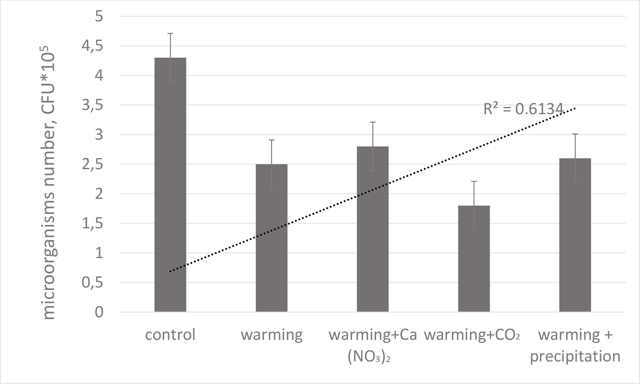 Possible mechanisms for the rational use of the mentioned results. The authors assume that the total microbial population in the soil can indirectly influence the change in the total NCM amount that the authors have observed in response to the introduced factors. The authors have recorded that the increased soil moisture changes the abundance of total NCMs both positively and negatively (Fig. 4). Strong humidification negatively affects the number of microorganisms, but the presence of warming, which obviously leads to the evaporation of excess moisture, contributes to an increase in the number of microorganisms.