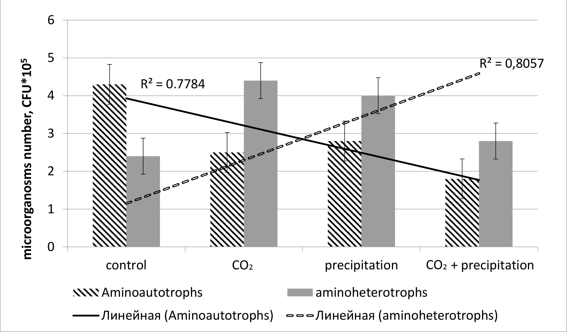 The authors observe a total NCM similar reaction to carbon dioxide and increased soil moisture (Fig. 6). As for individual groups, we see a trend toward an increase in the number of aminoheterotrophs and a decrease in the number of aminoautotrophs. Our approximation reliability values are 0.8057 (aminoheterotrophs) and 0.8784 (aminoautotrophs), which is a fairly acceptable result, characterizing the smoothing as reliable.
