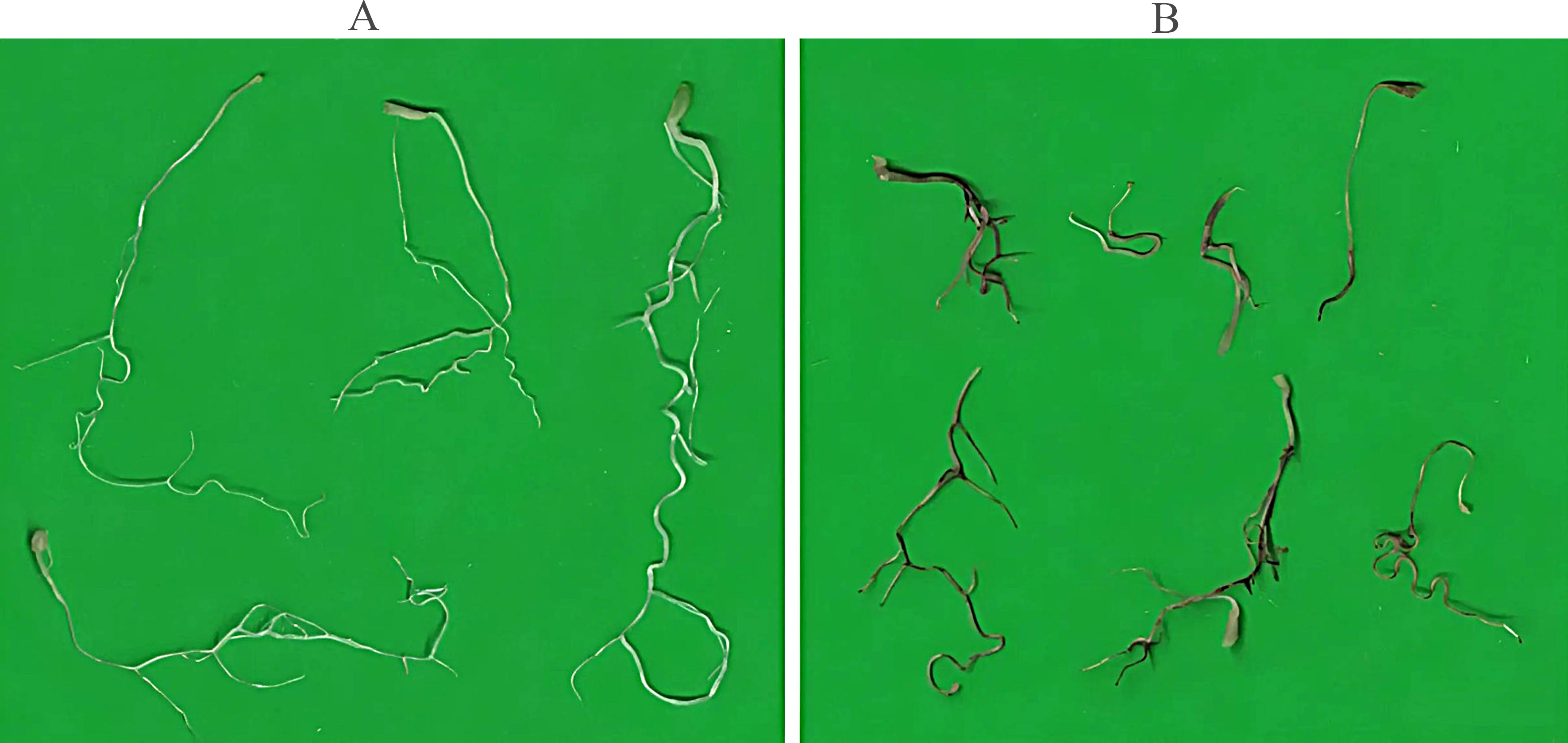 Changes in alfalfa root morphology under the influence of phenanthrene. (A) Roots of plants grown in uncontaminated sand. (B) Roots of plants grown in phenanthrene-contaminated sand (200 mg/kg).