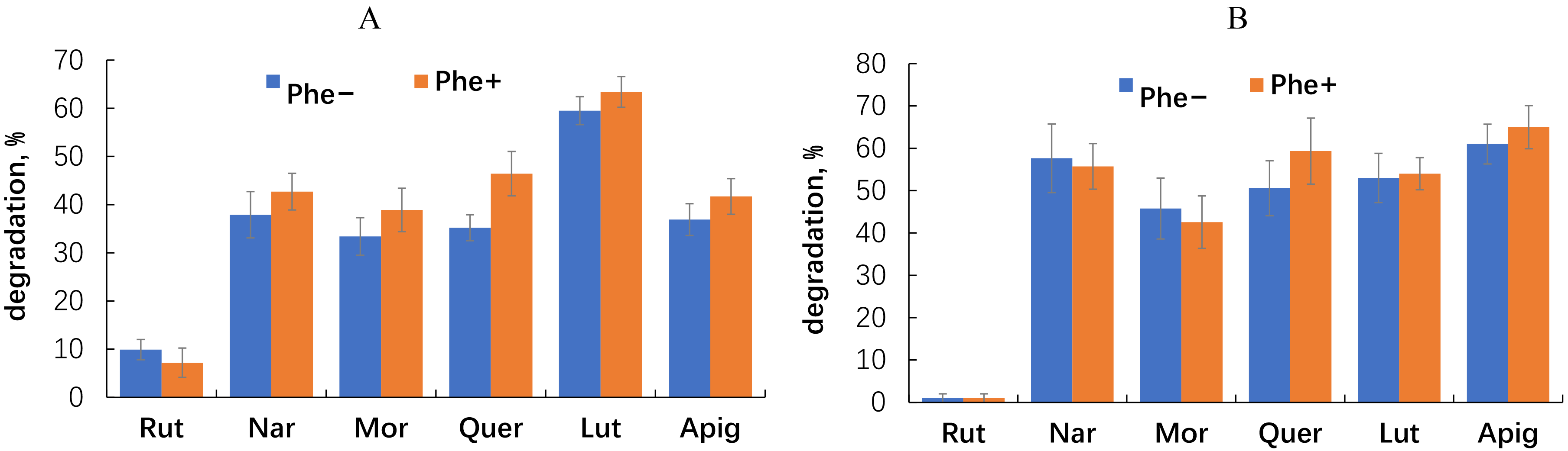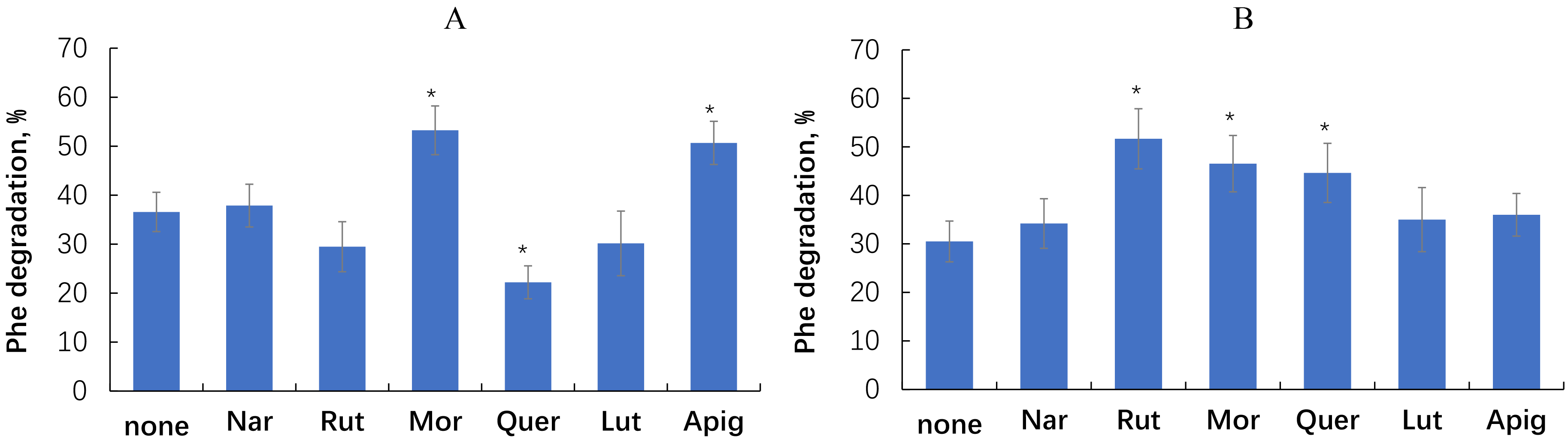 Phenanthrene degradation by E. meliloti P221 was most effectively promoted by morin (+46%) and apigenin (+39%), whereas quercetin inhibited phenanthrene degradation by 39%. With M. gilvum PAM1, the most pronounced stimulatory effect (+69%) was exerted by rutin, followed by morin (+53%) and quercetin (+46%).