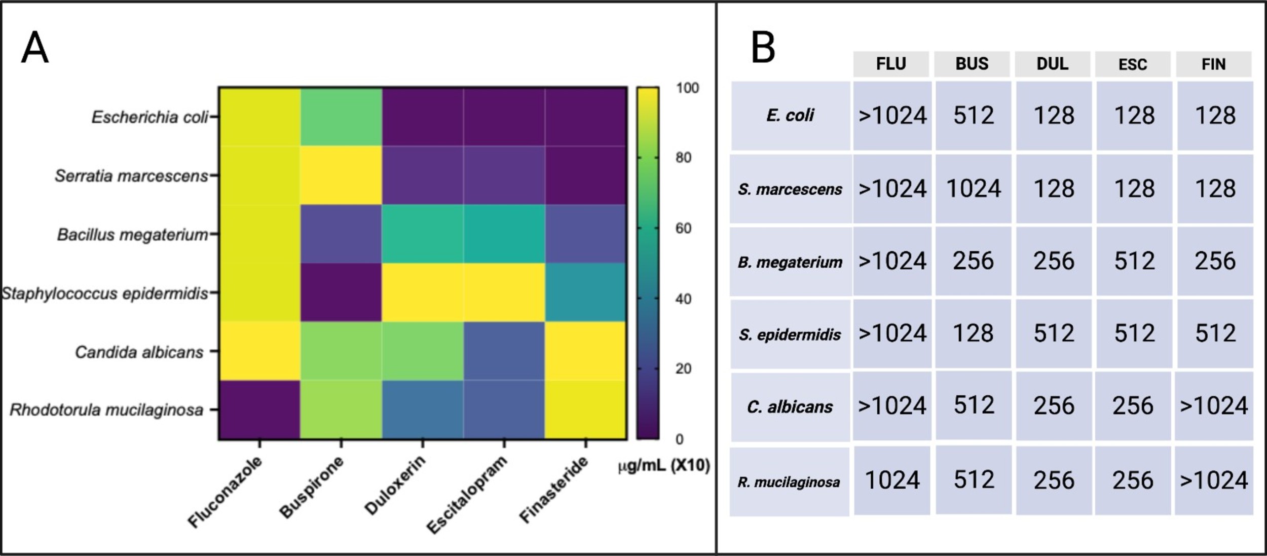 Antimicrobial susceptibility patterns of planktonic bacteria and yeast. (A) Heatmap illustrating the minimum inhibitory concentration (MIC) required to inhibit 90% of microbial growth (MIC90) relative to untreated controls. Color intensity corresponds proportionally to increasing drug concentrations. (B) Summary table displaying the MIC90 values (mg/L, equivalent to µg/mL) for each antimicrobial agent tested against individual microorganisms. FLU, fluconazole; BUS, buspirone; DUL, duloxetine; ESC, escitalopram; FIN, finasteride.