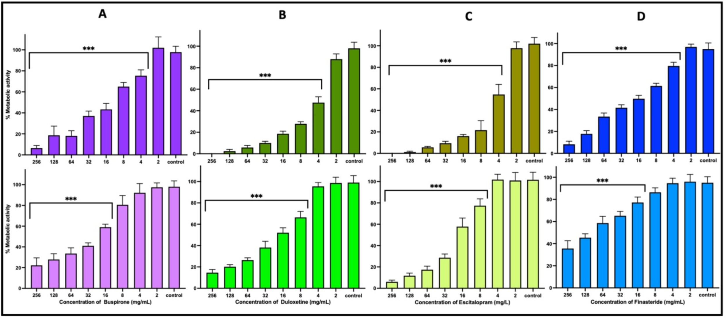 Duloxetine and escitalopram demonstrated broad-spectrum antimicrobial activity, inhibiting bacterial and fungal growth at concentrations below 512 mg/L. Buspirone exhibited selective antimicrobial effects, particularly against Gram-positive bacteria and C. albicans. Although finasteride exhibited limited direct antifungal activity, it significantly disrupted key virulence traits in yeasts, including biofilm formation, morphological transitions, and host infection capacity.