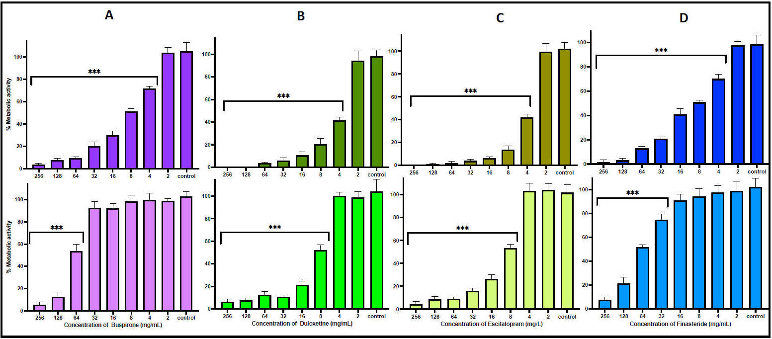 Duloxetine and escitalopram emerged as the most effective antimicrobial agents among the tested compounds, exhibiting broad-spectrum activity at relatively low concentrations (128–512 mg/L). Both drugs demonstrated notable efficacy against all microbial species evaluated in this study, with particularly strong activity against Gram-negative bacteria. These findings align with prior research suggesting the antimicrobial potential of SSRIs and SNRIs against enteric pathogens [56, 57, 58]. For instance, structurally similar antipsychotics and antidepressants, such as atomoxetine, have shown effectiveness against Salmonella and Yersinia species. Moreover, a study conducted by Chavez-Dozal AA et al. [59] reported that escitalopram significantly inhibited the growth of 47 clinical isolates of Gram-positive bacteria, highlighting its potential as a repurposed antibacterial agent with activity across a wide microbial spectrum.