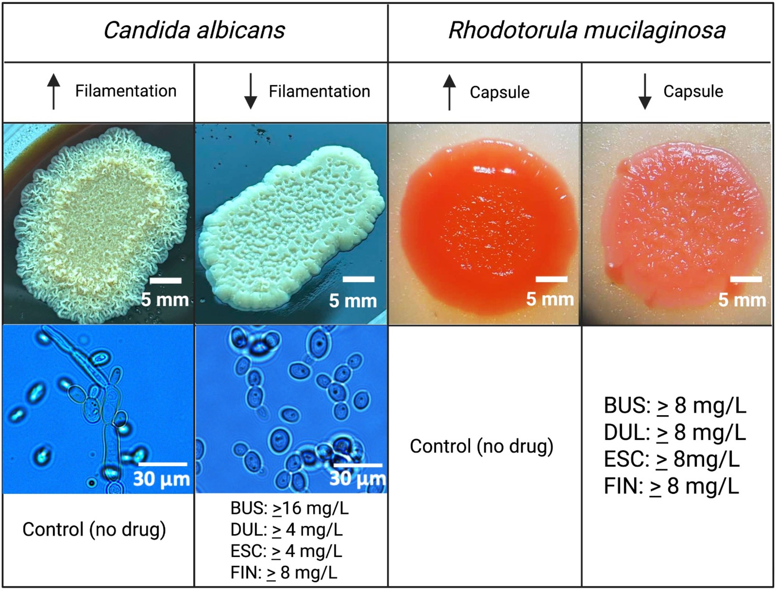 filamentation and Rhodotorula mucilaginosa capsule formation.