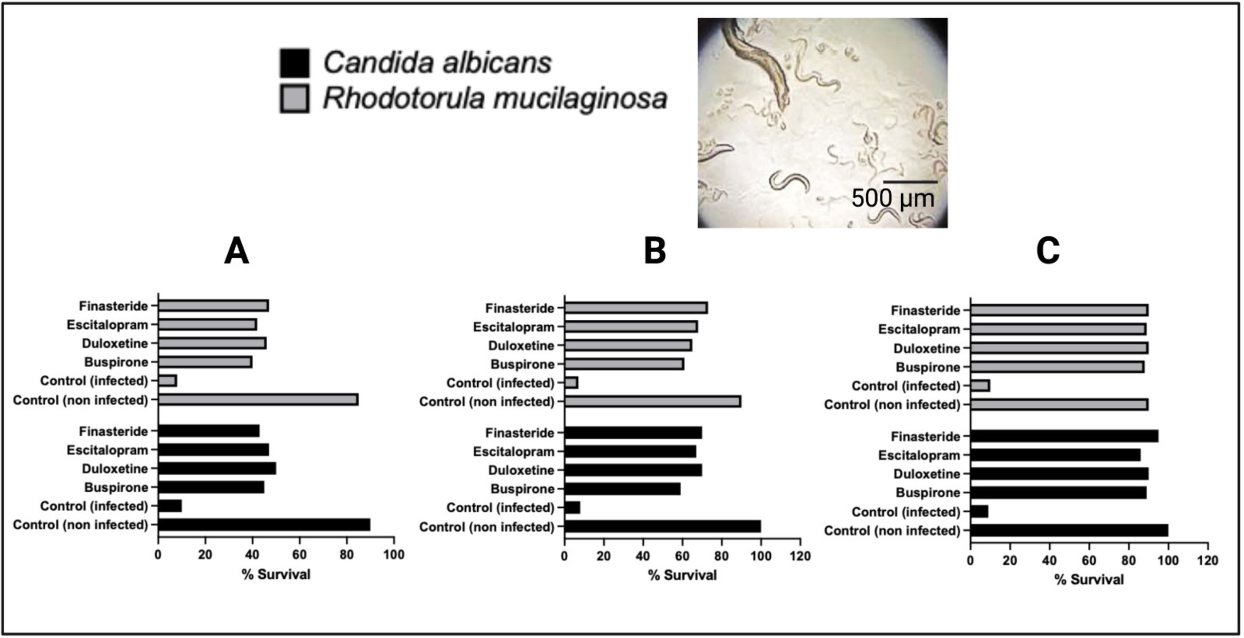RT conceived the original idea for the study, selected the antidepressants, and conducted viability assays, filamentation studies, nematode infection assays, and statistical analyses. SCV carried out minimum inhibitory concentration (MIC) determinations and contributed to the nematode assays. AJ performed MIC assays with bacterial strains, while KD conducted yeast growth experiments and selected MIC assays with Rhodotorula mucilaginosa. DS substantially helped with designing the research study and provided critical revisions of the manuscript and contributed expert insight into the finasteride literature. LR conducted biofilm assays with yeast strains. HC contributed substantially to the analysis and interpretation of data, and offered expert feedback, editorial input, and overall guidance. AC supervised the research, performed biofilm, MIC, and filamentation assays, authored the manuscript, and secured funding for the study. All authors contributed to editorial changes in the manuscript. All authors read and approved the final manuscript. All authors have participated sufficiently in the work and agreed to be accountable for all aspects of the work.