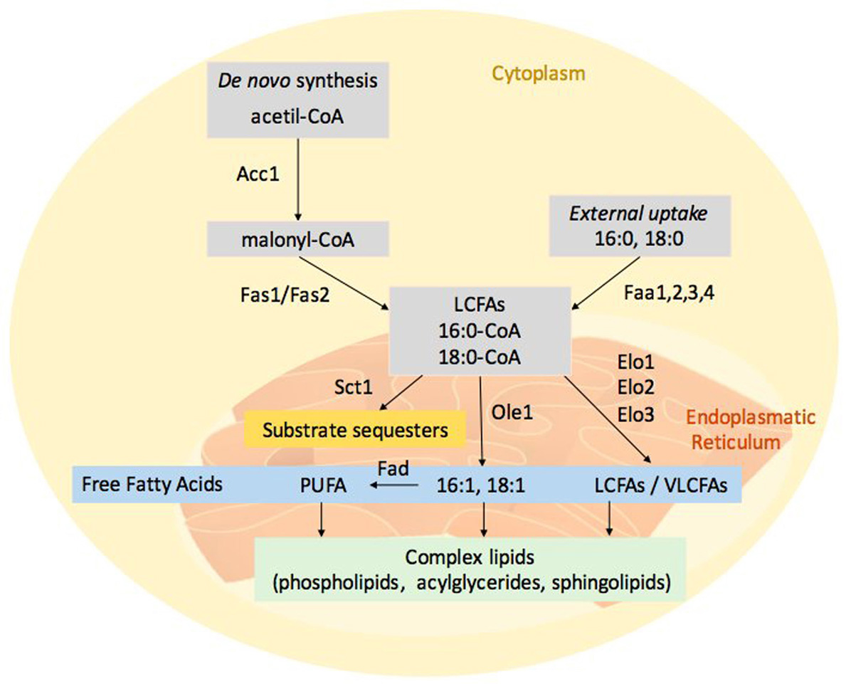 Figure 1Fungal fatty acid metabolism. Fatty acids derive from both de novo synthesis and external uptake. Acetyl-CoA carboxylase (Aac1) catalyses the carboxylation of acetyl-CoA to malonyl-CoA and cytosolic multi-enzyme fatty acid synthase complex (Fas1p/Fas2) generates the acyl-CoA with an acyl chain length of 16 or 18 carbon atoms. Long chain (LCFAs) and very long chain fatty acids (VLCFAs) are localized in the endoplasmatic reticulum. The elongation machinery presents different fatty acid elongation enzymes, Elo1 has specificity for the elongation of C12–16 to C16–18 FAs, whereas Elo2 elongates C16–18 up to C22 and Elo3 elongates C18 up to C26. Ole1 and other desaturases (Fad) respectively can convert the pivotal fatty acids, 16:0-CoA and 18:0-CoA, in mono and poly-unsaturated fatty acids (PUFAs). FFA can be incorporated into complex membrane lipids (phospholipids, acylglycerides and sphingolipids). Sct1 enzyme is an Ole1 competitor; its action reduces the PUFAs formation.