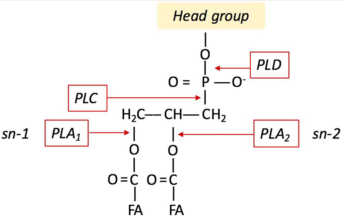 Figure 2Sites of phospholipid hydrolysis by PLD, PLC, PLA1, PLA1.