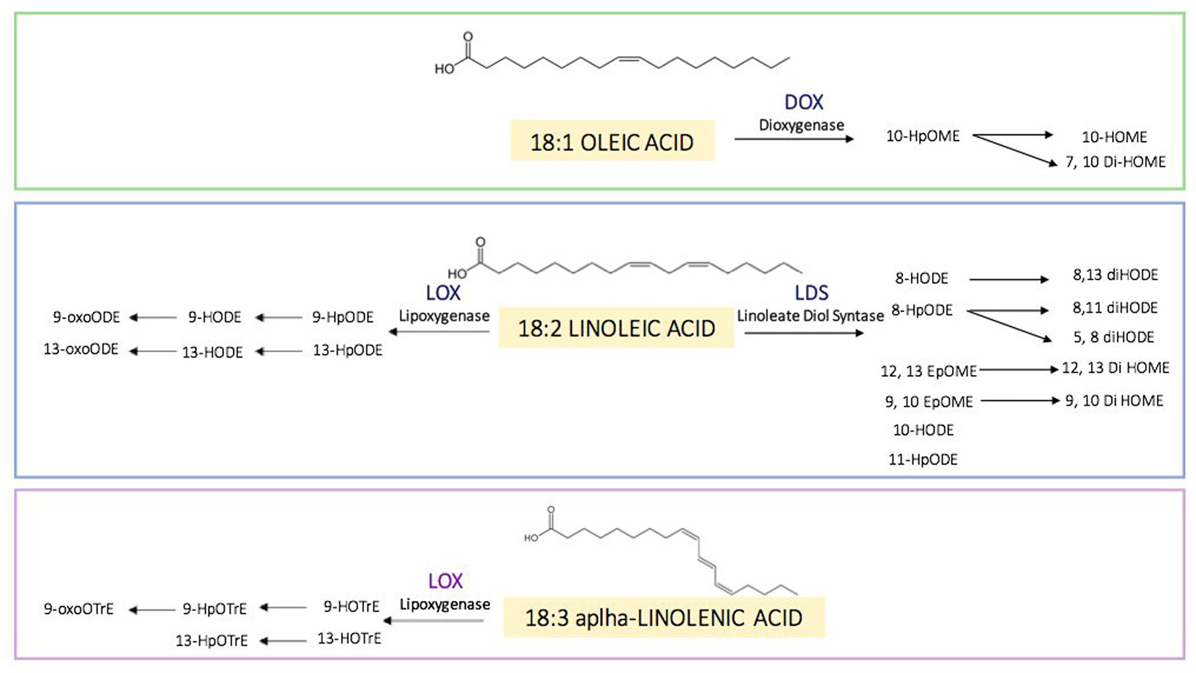 Figure 3Oxylipins found in fungi and their enzymatic routes. Principal substrates of oxylipins (18:1 oleic, 18:2 linoleic and 18:3 alpha-linolenic acid). FAs can be converted in several oxylipins through the catalytic action of several enzymes: dioxygenases (DOXs), lipoxygenases (LOXs) and linoleate diol synthases (LDSs). Oxylipins formed can be further reduced and oxidised both enzymatic and non-enzymatic action.