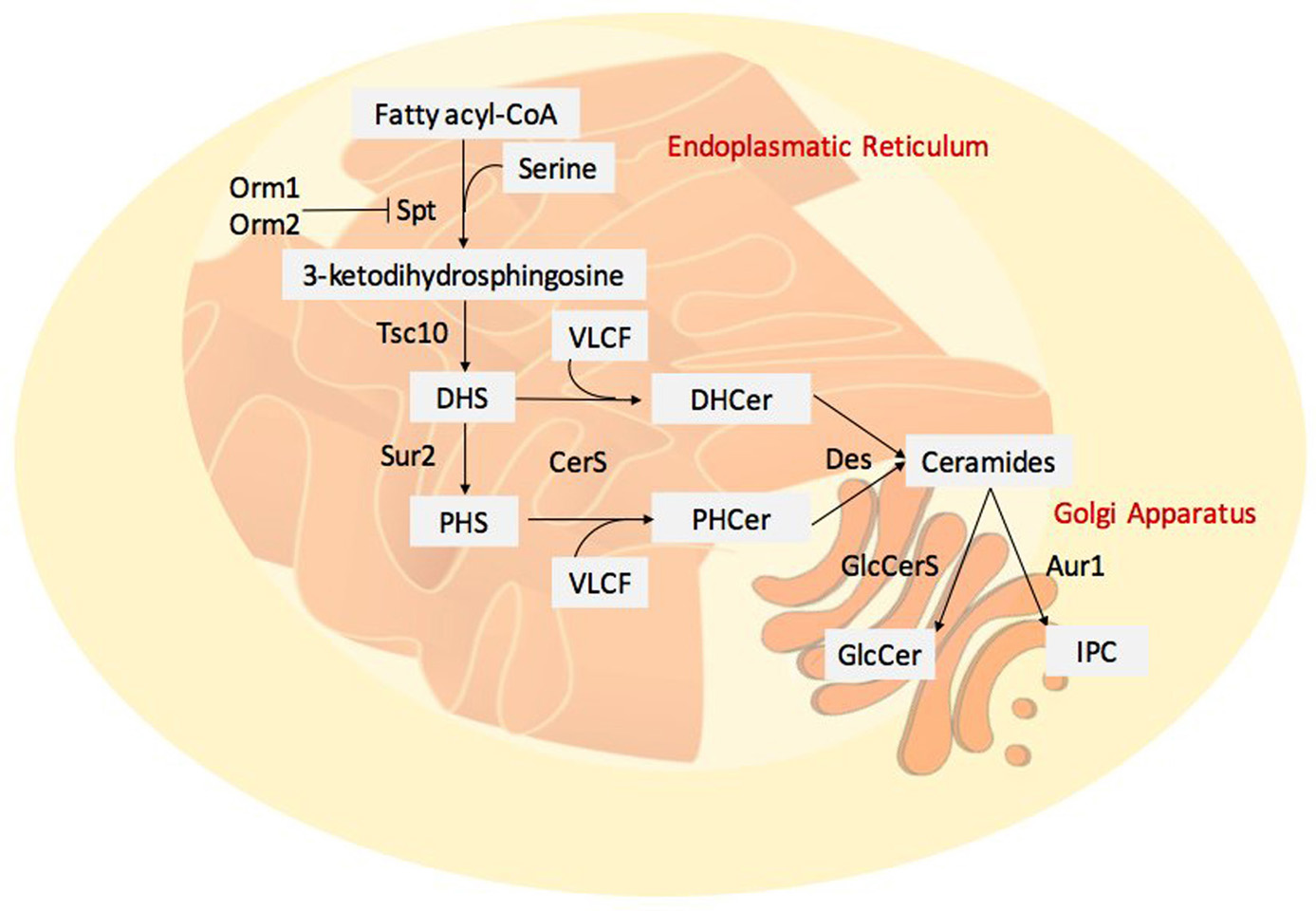 In the model organism Saccharomyces cerevisiae, de novo synthesis of sphingolipids begins with the condensation of a serine with a fatty acyl-CoA, normally palmitoyl-CoA or stearyl-CoA, catalysed by the serine palmitoyl-transferase (SPT) complex (78-79). Two ER’s proteins Orm1 and Orm2 are able to bind the SPT complex and inhibit its activity; this is an important step in sphingolipid biosynthesis regulation (80). The last reaction generates 3-ketodihydrosphingosine and the reductase Tsc10 catalyses the formation of dihydrosphingosine (DHS) (81). To generate the phytosphingosine (PHS), the Sphingolipid C4-hydroxylase (Sur2) can hydroxylate DHS (82). Ceramide Synthase Complex catalyses the association between the LCB (DHS or PHS) and VLCFA formed of Lag1, Lac1 and Lip1 (83-84). This complex forms dihydroceramides (DHCer) and phytoceramides (PHCer); these compounds can be further desaturated (by Des) to form the ceramides. Complex yeast ceramides present the addition of head groups; for example, the IPC synthase (Aur1) catalyses the transfer of the phosphoinositol to ceramides (85).