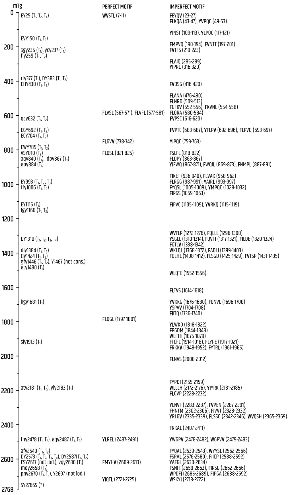 In mTg, these characteristics at columns 22-26 are more tenuous, with Tyr in the first position, Met in the second and Pro in the third or fourth position occurring with corresponding frequencies of 2/19, 3/19 and 4/19; the fifth position is Cys in 6/19 cases. Columns 22-26 downstream of Y708 and Y785 are occupied by the same perfect motif. Six Tyr are part of a perfect (Y2487) or imperfect motif (Y692, Y1006, Y2181, Y2478 and 2540), and another Tyr (Y2587) precedes an imperfect motif just immediately. Phe, Tyr or Trp at column 22 are located six to 105 residues away from Tyr at column 9. Interestingly, this distance is of the same magnitude for pairs of Tyr, namely 14 residues for Y1384 and Y2670, 21 residues for Y2540 and Y2487, 45 residues for Y430 and Y704, and 105 residues for Y1166 and Y1446.