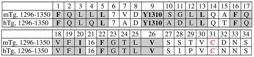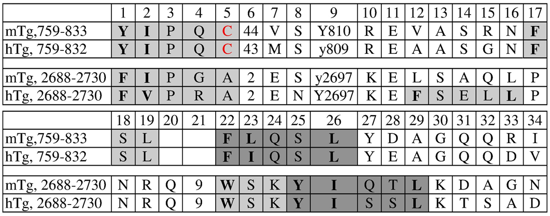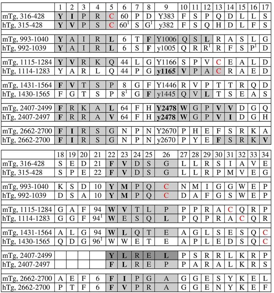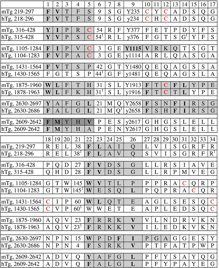 Figure 9Comparison between the amino acid sequences of mouse Tg (mTg) and human Tg (hTg) which include tyrosines that form MIT only in mTg or only in hTg (column 9) and their closest upstream and downstream TH-binding motifs. When a motif is not conserved in either Tg, the amino acids in the corresponding positions are shown, without boldface letters and on white background. Footnote: A lower case Y (y) in column 9 indicates that such tyrosine is not iodinated. Perfect motifs are written on a dark gray background, imperfect motifs on a light gray background. Residues that match those at first, second or fifth position of the 5-residue motif (F/Y/W, I/L/M/V, X, X, I/L/M/V) are typed boldface. Cysteines are typed in red. 1Mutations of hTg residues associated with congenital hypothyroidism: L253, R296, Q329, G381, C1264, W1437, S1466, D1513, R1530, C1897, I1931, Q2657.