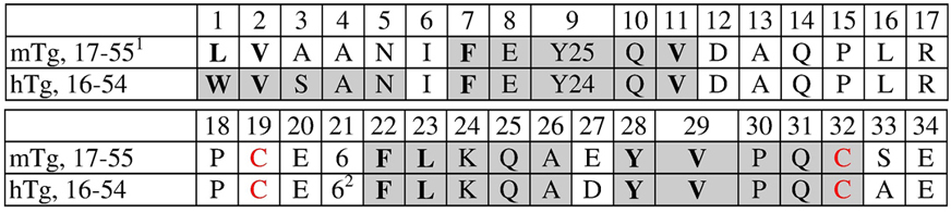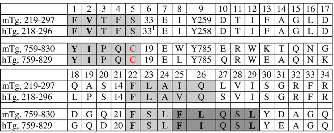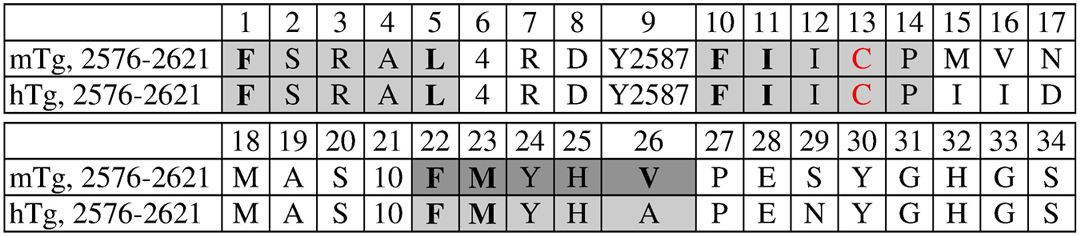 Figure 14Comparison between the amino acid sequences of mouse Tg (mTg) and human Tg (hTg) which include tyrosines iodinated in mouse Tg as containing MIT, DIT and T4, but containing MIT, T4 and T3 (viz, maintaining MIT and T4-forming property but exchanging DIT for T3) in human Tg (column 9), and their closest upstream and downstream TH-binding motifs. When a motif is not conserved in either Tg, the amino acids in the corresponding positions are shown, without boldface letters and on white background. Footnote: Perfect motifs are written on a dark gray background, imperfect motifs on a light gray background. Residues that match those at first, second or fifth position of the 5-residue motif (F/Y/W, I/L/M/V, X, X, I/L/M/V) are typed boldface. Cysteines are typed in red. 1For mTg a perfect upstream motif is WVSTL (aa 7-11), corresponding to FTLLA (aa 8-12) in hTg. 2R38K (R19K in the mature protein) mutation of hTg.