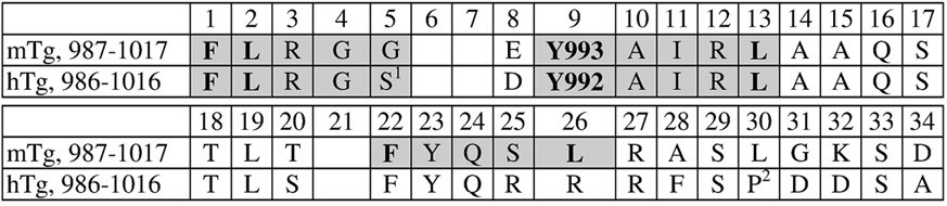 Figure 16Comparison between the amino acid sequences of mouse Tg (mTg) and human Tg (hTg) which include tyrosines iodinated in mTg as MIT, DIT and T3, but containing MIT and DIT in hTg, thus losing T3-formation (column 9), and their closest upstream and downstream TH-binding motifs. When a motif is not conserved in either Tg, the amino acids in the corresponding positions are shown, without boldface letters and on white background. Footnote: Imperfect motifs are written on a light gray background. Residues that match those at first, second or fifth position of the 5-residue motif (F/Y/W, I/L/M/V, X, X, I/L/M/V) are typed boldface. 1S990I (S971I in the mature protein) mutation in hTg. 2P1012L (P993L in the mature protein) mutation in hTg.