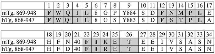 Figure 17Comparison between the amino acid sequences of mouse Tg (mTg) and human Tg (hTg) which include tyrosines iodinated in mTg as only MIT, but as only DIT in hTg (column 9), and their closest upstream and downstream TH-binding motifs. Footnote: Imperfect motifs are written on a light gray background. Residues that match those at first, second or fifth position of the 5-residue motif (F/Y/W, I/L/M/V, X, X, I/L/M/V) are typed boldface. 1Q870H (Q851H in the mature protein) mutation in hTg.