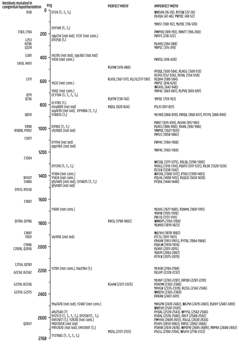 Figure 1 and Figure 2 illustrate the positions of both perfect and imperfect TH-binding motifs in mTg and hTg, respectively. For hTg, this Figure also highlights such positions relative to the position of amino acids that have been reported to be mutated in patients with congenital hypothyroidism (15).