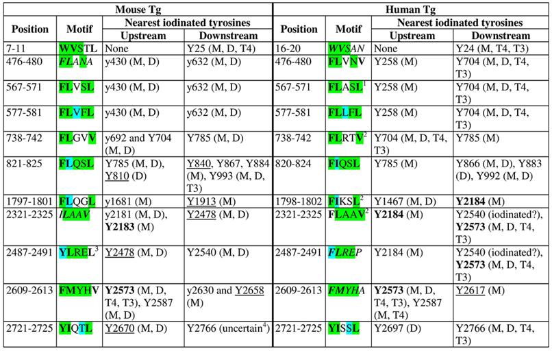 Figure 3Perfect 5-residue thyroid hormone-binding motifs in mouse Tg (mTg, accession number AAB53204.1) and human Tg (hTg, accession number NP_003226.4), and their positions in relation with the nearest upstream and downstream iodinated tyrosines. Footnote: M=monoiodotyrosine; D=diiodotyrosine. Residues that match those at first, second or fifth position of the 5-residue motif (F/Y/W, I/L/M/V, X, X, I/L/M/V) are typed boldface. Identical or conservatively replaced residues between the two species at any position are highlighted in green or turquoise, respectively. When in either species the motif is imperfect, it is typed italicized. Of the tyrosines of mTg appearing in this table, those not conserved in hTg are written in lower case (y). Underlined tyrosines in Tg of one species indicate that they become noniodinated in Tg of the other species. Corresponding tyrosines that form the same iodotyrosine(s) and/or iodothyronine(s) in the two species are typed bold-faced in columns 3, 4, 7 and 8 of this Table. 1Residue L571 was found to be mutated in patients with congenital hypothyroidism due to Tg mutations. 2Residues Q736, Q1796 and G2319, located very close to perfect 5-residue thyroid hormone binding motif, were found to be mutated in patients with congenital hypothyroidism due to Tg mutations. 3The tyrosine in the motif YLREL is iodinated (M, D). 4According to Dedieu et al. (11), “no definitive conclusion should be drawn” about the iodination status of Y2766 of mTg.