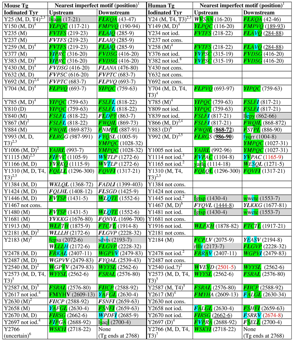 Figure 4Imperfect 5-residue thyroid hormone-binding motifs in mouse Tg (mTg) and human Tg (hTg) that are located closest to iodinated tyrosines. Footnote: cons.=conserved; iod.=iodinated; M=monoiodotyrosine; D=diiodotyrosine. Residues that match those at first, second or fifth position of the 5-residue motif (F/Y/W, I/L/M/V, X, X, I/L/M/V) are typed boldface. Identical or conservatively replaced residues between the two species at any position are highlighted in green or turquoise, respectively. Imperfect motifs are typed italicized. In hTg, a position is underlined and boldfaced to indicate that one of the five residues in the motif was reported to be mutated in cases of congenital hypothyroidism associated with Tg mutations (Q870, S990). The position is underlined only, when such mutation occurs very close to the motif (C194, R296, A2234, Q2657). Other mutations (C1264, W1437, C2006, Q2016, R2336, G2374, G2375) occurred very close to imperfect motifs not shown in this table. 1When a 5-residue motif in one species loses the sequence to qualify as a motif in the corresponding position of the other species, the said sequence is reported in the table, but printed lower case on gray blackground. When the imperfect motif is conserved, but the nearest motif is different between mTg and hTg, position numbers in hTg are written in red. 2The tyrosine is part of a motif. Consensus motifs for iodinated tyrosines: 3EY, 4EXY, 5DY, 6SYS, 7TYS. 8No consensus motif for iodination.