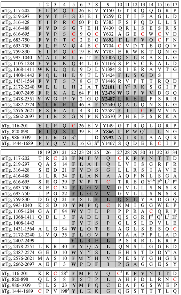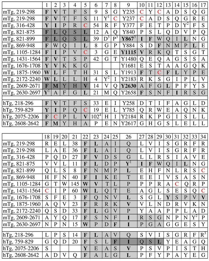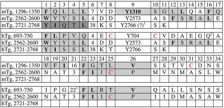 Figure 5Amino acid sequences of mouse Tg (mTg) and human Tg (hTg) which include tyrosines that form MIT only (column 9) and their closest upstream and downstream TH-binding motifs. Footnote: Perfect motifs are written on a dark gray background, imperfect motifs on a light gray background. Residues that match those at first, second or fifth position of the 5-residue motif (F/Y/W, I/L/M/V, X, X, I/L/M/V) are typed boldface. Cysteines are typed in red. 1In position other than column 9, also this tyrosine forms MIT. 2These tyrosines of mTg form both MIT and DIT: Y383, Y2170, Y2181. 3These amino acids are the terminal part of the imperfect motif FDLPY (863-867. 4Amino acids R296, C2154 and Q2161 were reported to be mutated in cases of congenital hypothyroidism associated with Tg mutations.