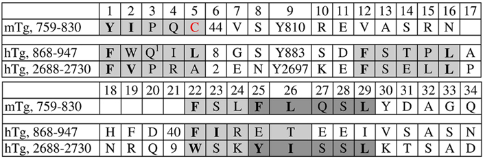 Figure 6Amino acid sequences of mouse Tg (mTg) and human Tg (hTg) which include tyrosines that form DIT only (column 9) and their closest upstream and downstream TH-binding motifs. Footnote: Perfect motifs are written on a dark gray background, imperfect motifs on a light gray background. Residues that match those at first, second or fifth position of the 5-residue motif (F/Y/W, I/L/M/V, X, X, I/L/M/V) are typed boldface. Cysteines are typed in red. 1Amino acid Q870 was reported to be mutated in cases of congenital hypothyroidism associated with Tg mutations.