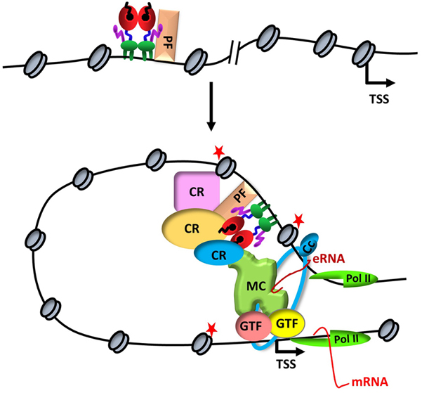 Figure 1ERα-mediated transcription. Upon binding to a distal estrogen receptor binding site (ERBS) in collaboration with a pioneer factors (PF), ERα leads to an interdependent sequence of events that involves the recruitment of coregulatory proteins (CR), nucleosome remodeling, increased chromatin accessibility, histone modifications (red stars), assembly of basal transcription machinery that includes mediator complex (MR) and Pol II, leading to enhancer RNA (eRNA) production and chromatin looping. eRNA then interacts with looping factors (cohesin complex, Cc) to facilitate/stabilize chromosomal looping between the enhancer and promoter and participates in the recruitment of Pol II to the promoter for transcription initiation of target gene (mRNA).