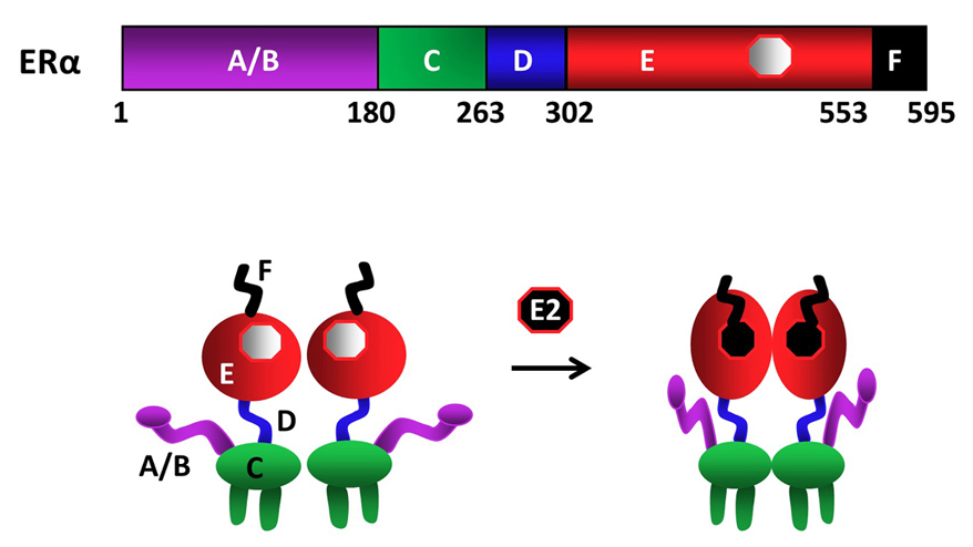 Figure 1Schematics of ERα structural regions. ERα is composed of 595 amino-acids. The amino terminal A/B domain, the central C region, or the DNA binding domain (DBD), the flexible hinge, or D, domain containing a nuclear localization signal, and the multi-functional carboxyl terminal (E/F) domain are indicated. ERα is a dimer with or without the endogenous ligand 17β-estradiol (E2), binding of which induces conformational changes in the receptor dimer. Figure is modified from (210).