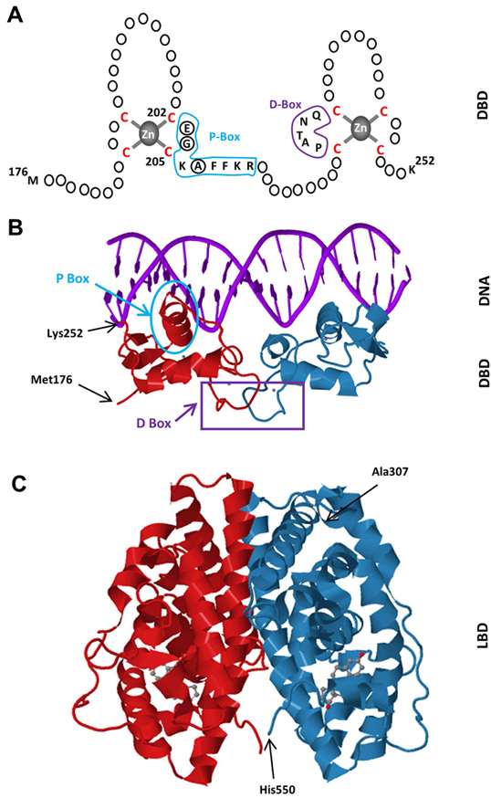 Figure 2Schematics of the DBD of ERα. The DBD of ERα monomer contains two zinc-binding motifs formed by a zinc ion (grey) coordinated by four cysteine residues (red). A region of the first zinc-finger module, the P-box (blue) which contains amino-acids particularly glutamic acid (E), glycine (G) and alanine (A) at positions 203, 204 and 207 respectively (circularized), determine the DNA binding specificity critical for sequence discrimination and binding to ERE. The residues (purple) in the second zinc finger module, the D-box, are involved in the discrimination of half-site spacing. B. Tertiary structure of the ERα-DBD (residues Met176-Lys252) as dimer bound to the consensus DNA sequence, GGTCAnnnTGACC, (Estrogen Responsive Element, ERE) (PBD ID: 1HCQ; (63)). The P (blue) and D (purple) boxes are indicated. C. The tertiary structure of the ERα-LBD (residues Ala307-His550) dimer bound to E2 (grey) (PDB ID: 1QKU; (255).