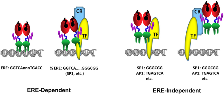 Figure 3Schematics of ERα-DNA interactions. In the ERE-dependent transcriptions, ERα directly interacts with an ERE sequence (GGTCAnnnTGACC). ERα can also interact with a composite element composed of a ½ERE sequence (GGTCA) and a response element for a transcription factor (TF). In this binding mode, the interaction of ERα with DNA is stabilized (anchored) by a direct, or indirect through coregulatory protein (CR), interaction with a Transcription Factor (TF) bound to its cognate response element, for example GC box (GGGCGG) for SP1 protein binding, juxtaposed to the ½ERE sequence. The ERE-independent binding refers to the indirect association of ERα with DNA through a direct, or through coregulatory protein (CR), interaction with a Transcription Factor (TF) bound to its cognate response element, for example GGGCGG motif for SP1 protein or TGAGTCA motif for AP1.